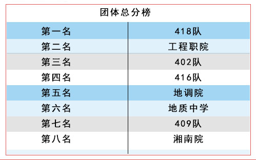 初冬时节,水渡河畔。2016年11月18-20日,省地勘局第二届职工运动会在湖南工程职业技术学院进行了为期3天的职工运动会。经过3天激烈地角逐,6个集体项目和30个个人项目冠军花落各家, 418队、工程职院、402队、416队、地调院、地质中学、409队、湘南院等8个代表队分获团体第1至第8名。